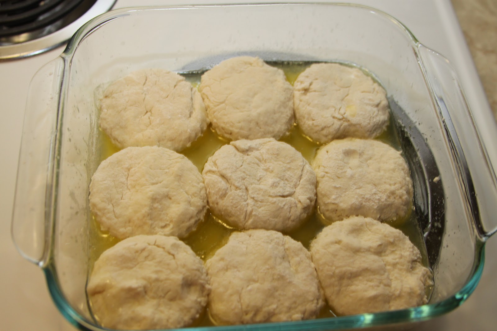 Melt butter in a glass 8x8 baking dish. Cut biscuits using a medium biscuit cutter then dip the top of the biscuit in butter and arrange in dish.